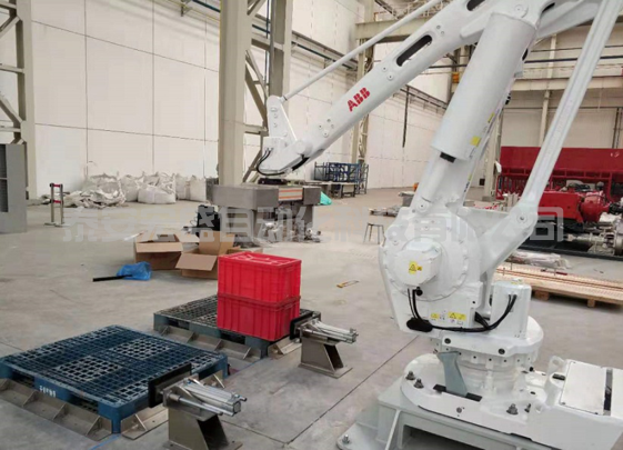 1.項(xiàng)目通過 ABB 碼垛機(jī)器人滿足客戶要求:臂展大,負(fù)重 180Kg,能夠滿足客戶同時(shí)在一側(cè)安放兩個(gè)棧板的需求;