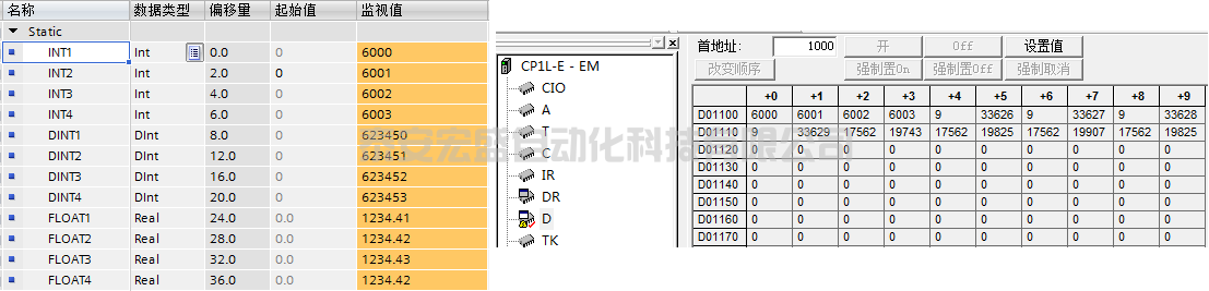 再往DB6里面寫入幾個數(shù)據(jù),將網(wǎng)線還原,稍等一下,將筆記本的IP改回到1網(wǎng)段,通過歐姆龍的PLC軟件監(jiān)視一下看值有沒有過來,監(jiān)視效果如下圖: