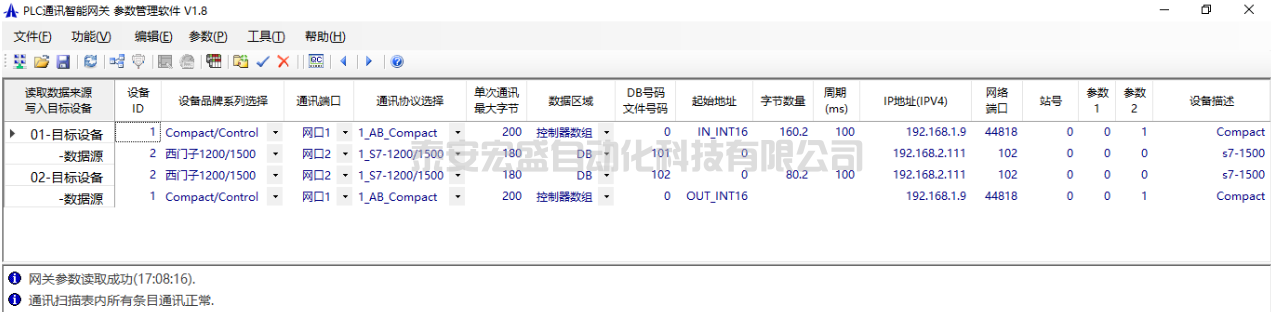上表中設(shè)備ID是每臺PLC設(shè)備的號碼,可在1~254之間自由分配;DB號碼/文件號碼參數(shù)里AB的PLC對應(yīng)數(shù)組內(nèi)的起始地址,支持多維數(shù)組,比如二維數(shù)據(jù)格式為0,0;起始地址參數(shù)里AB的PLC對應(yīng)數(shù)組名稱,或者變量名稱,須要與PLC內(nèi)的名稱完全一致;字節(jié)數(shù)量設(shè)置交互的字節(jié)數(shù)據(jù),只需設(shè)置目標設(shè)備的數(shù)量,上圖中的160,2表示160個字節(jié),PLC內(nèi)存為2字節(jié)數(shù)據(jù),如果PLC的數(shù)組數(shù)據(jù)類型是DINT,則設(shè)置為160,4;網(wǎng)絡(luò)端口參數(shù)AB的是44818,S7的是102;更詳細的參數(shù)介紹查看網(wǎng)關(guān)的手冊第6章