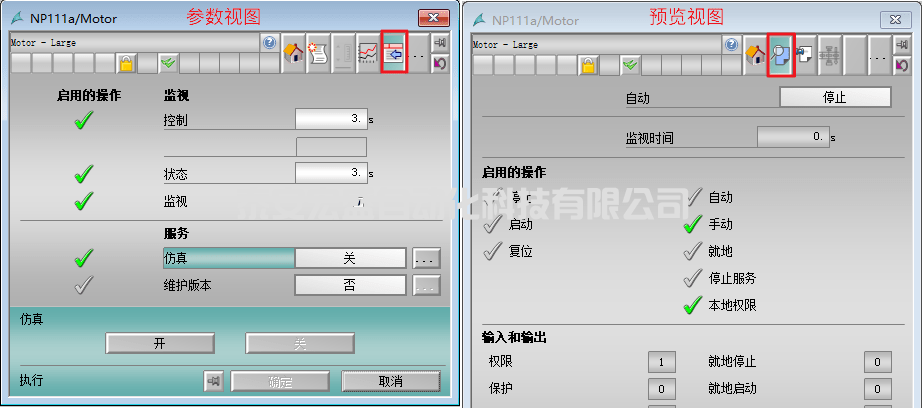 電機(jī)面板不止提供簡(jiǎn)單的啟停和連鎖控制,還可以在參數(shù)面板設(shè)置監(jiān)視時(shí)間、仿真模式、維護(hù)發(fā)布等,另外預(yù)覽值視圖可以查看當(dāng)前模式和狀態(tài)、監(jiān)視時(shí)間、哪些操作可以啟用、關(guān)鍵參數(shù)的輸入和輸出值等功能。