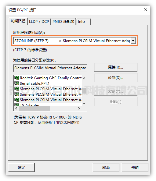 通過(guò)控制面板,打開(kāi)設(shè)置PG/PC接口界面,按照下圖所示設(shè)置應(yīng)用程序訪(fǎng)問(wèn)點(diǎn):