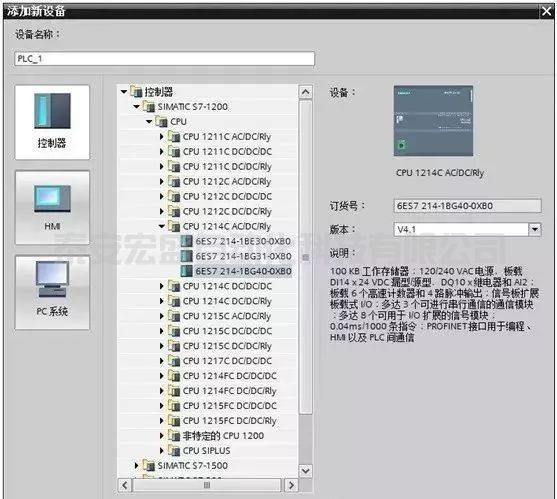 雙擊項目樹中的“添加新設備”,選中“添加新設備”對話框中的V4.1版的CPU 1214C AC/DC/Rly, 其PN接口的IP地址為192.168.0.1,子網掩碼為255.255.255.0。單擊“確定”按鈕確認。