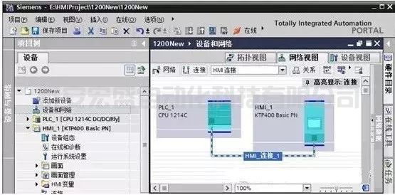 雙擊項目視圖中的“設備和網絡”,打開網絡視圖。單擊“連接”按鈕,自動選中“HMI連接”。用拖拽的方法連接HMI和PLC的PN接口,自動生成HMI_連接_1。