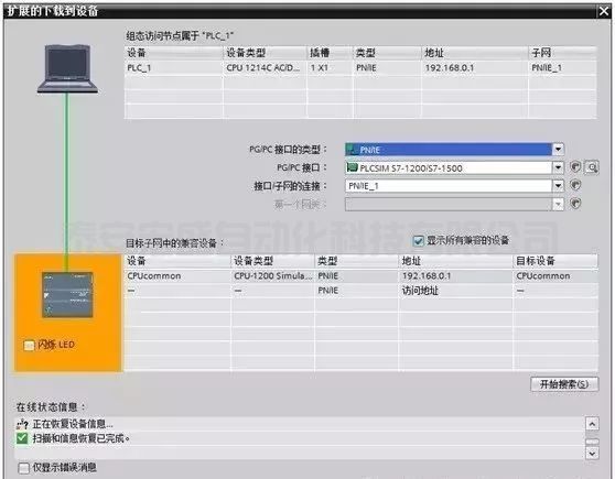 單擊“開始搜索”按鈕,“目標子網中的兼容設備”列表中顯示出搜索到的仿真CPU的以太網接口的IP地址。
