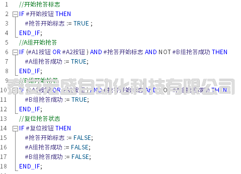 在該SCL的程序中,使用了IF…THEN…(條件執(zhí)行指令),它可以用中文的語言來進(jìn)行表達(dá),如果<條件>成立則執(zhí)行該程序語句。以該SCL程序中的第一句進(jìn)行舉例說明,它實(shí)現(xiàn)的功能是,如果開始按鈕按下,則置位搶答開始標(biāo)志。