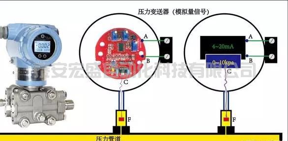 圖2中的器件叫壓力變送器。壓力變送器的內(nèi)部就是一塊電路板,電路板連接著一個壓力傳感器F。它的工作原理是壓力傳感器F把檢測到的壓力傳到電路板的C,檢測信號進入電路板后,通過電路板的轉(zhuǎn)換與計算,把這個壓力信號轉(zhuǎn)換成一個電流信號由A和B這兩個點輸出。圖中右邊就是轉(zhuǎn)換過程的示意圖,它可以把一個0-10kpa的壓力信號轉(zhuǎn)換成一個4-20mA的電流信號,由A和B這兩個點輸出。這時我們就說A和B這兩個點輸出的就是一個模擬量信號。模擬量信號的特點是它的值是在一個數(shù)值范圍內(nèi)是連續(xù)可變的。