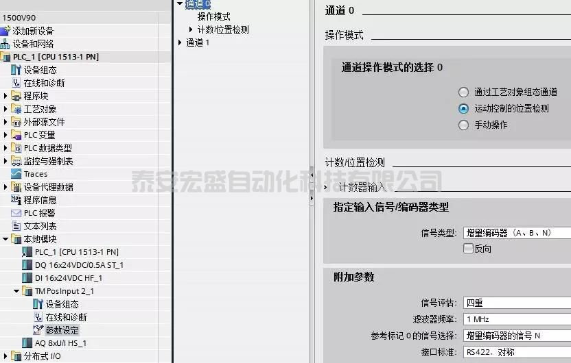 設置通道操作模式為運動控制的位置檢測(必須這樣設置,才能在隨后的編碼器連接中選擇高速計數(shù)模塊 TM PosInput2_1 及其通道號)。編碼器信號類型選擇增量編碼器(A、B、N),反向選擇暫不勾選,如果在調(diào)試時 PLC 給出的速度給定方向與編碼器反饋方向相反,就可以勾選反向來校正編碼器反饋方向。