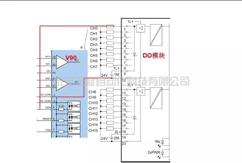 在本例中針對 DO 模塊的第 0 通道,DO 模塊的 1 端子與 V90 X8 接口的 5 端子相連、DO 模塊的 10 端子與 V90 X8 接口的 3 端子相連。DO 模塊的 9 端子和 10 端子分別要連接 24V+和 0V。其中 DO 模塊的 10 端子與 V90 X8 接口的 3 端子連接還起到兩個系統(tǒng)的等電位連接的作用。