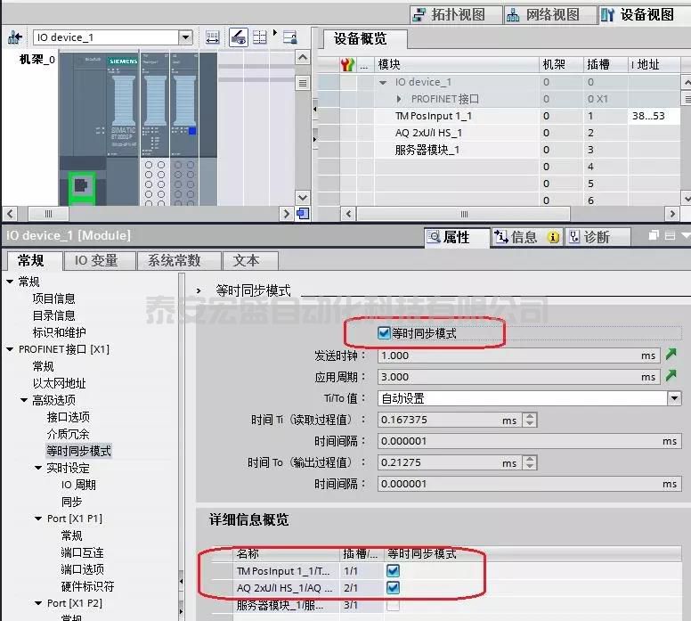 在“IO_device_1”的設備視圖中選擇“屬性”、“常規(guī)”、“等時同步模式”頁面,然后勾選站點以及站點上模塊的“等時同步模式”,如下圖所示: