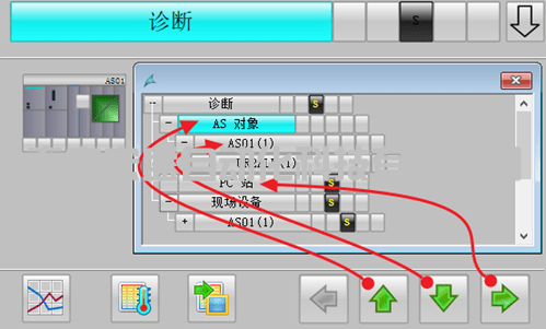 當進入到“AS對象“畫面后,上、下、右三個按鈕均可操作。點擊對應(yīng)按鈕后會分別進入到如下圖箭頭所示的畫面。其中上、下按鈕分別用于進入上一層級或下一層級的畫面,右按鈕用于進入并列層級的下一個畫面。
