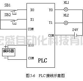 按照圖5-6,完成PLC控制系統(tǒng)的硬件連接。圖中由于脈沖信號發(fā)生器的信號與按鈕輸入信號不同,因此,不能共用一個COM端。
