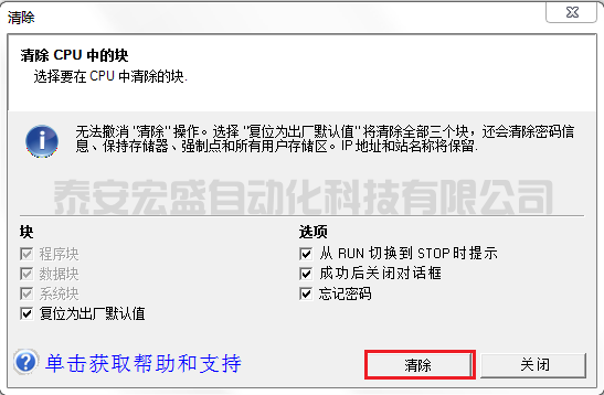 注意:從S7-200 SMART V2.3 開始,清除窗口中增加 “忘記密碼” 選項(xiàng), V2.3 之前的版本無此勾選項(xiàng)。