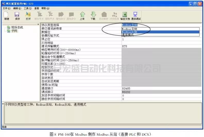 1)、使用配套軟件設(shè)置PM-160的現(xiàn)場總新和子網(wǎng)相關(guān)參數(shù)和命令通過撥碼開關(guān)將PM-160設(shè)置為配置狀態(tài),打開安裝的配置軟件,當(dāng)實現(xiàn)PLC與DCS通信時,子網(wǎng)協(xié)議類型設(shè)置為 Modbus從站,并設(shè)置串口通信波特率、數(shù)據(jù)位、奇偶校驗位、停止位、PM-160作為 Modbus從站的地址、通信接口。