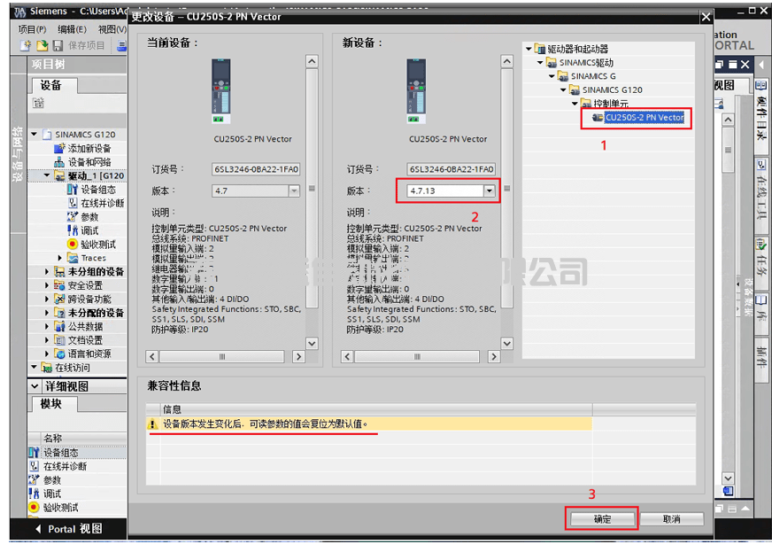 下面以G120 CU250S-2 PN為例,介紹將G120 CU250S-2 PN V4.7的項目文件,下載到控制單元CU250S-2 PN V4.7.13版本中的操作。