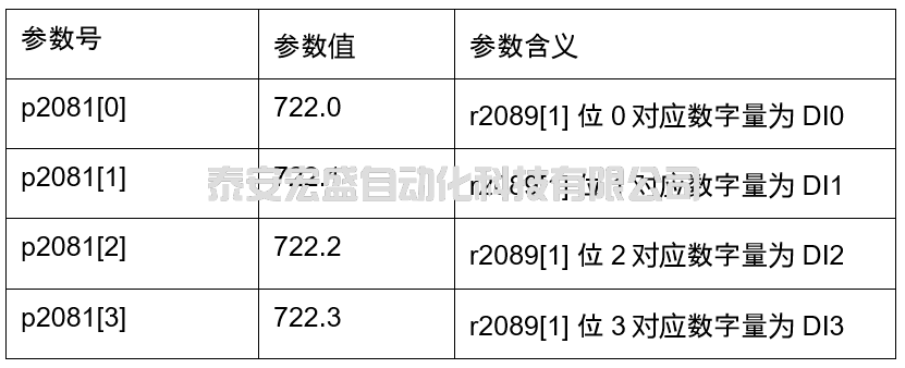 組合后的字對(duì)應(yīng)的參數(shù)為r2089.1,按上述設(shè)置后,r2089.1 bit 0為DI0狀態(tài),以此 類推r2089.1 bit 3為DI3狀態(tài),最后設(shè)置p2051.2=2089.1。