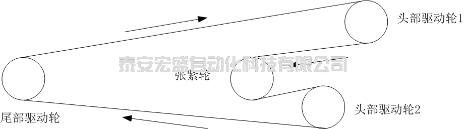 常見的軟連接負荷分配應用案例包括帶式輸送機。如下圖所示的帶式輸送機,采用3個驅動輪和一個張緊輪,其中頭部有兩個驅動輪,尾部有一個驅動輪。每個驅動輪各有一臺電機驅動,分別通過一臺變頻器實現(xiàn)輸送機的啟停和調速。