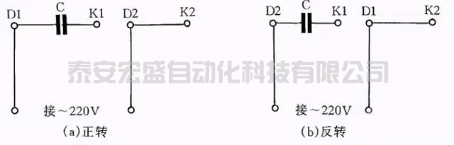 圖247為IDD5032型單相電容運轉(zhuǎn)電動機接線方法。其功率為60W,電容選用耐壓500V、容量為4μF的產(chǎn)品。圖3(a)為正轉(zhuǎn)接線,圖3(b)為反轉(zhuǎn)接線。