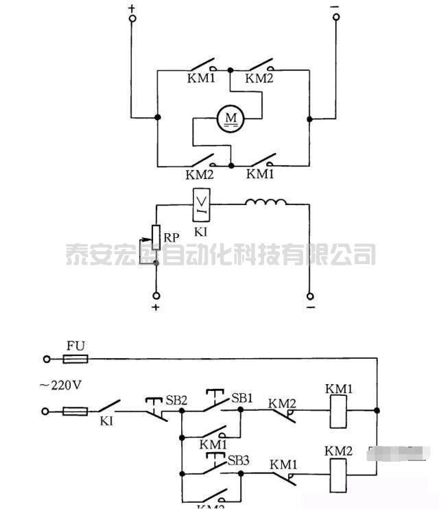在勵磁電路內(nèi),串聯(lián)一個欠電流繼電器KI,其常開觸點接在控制電路中。當勵磁電流消失或減小到設定值時,KI釋放,KI常開觸點斷開,切斷電動機電樞電源,使電動機停轉(zhuǎn),從而避免超速現(xiàn)象發(fā)生,見圖11。