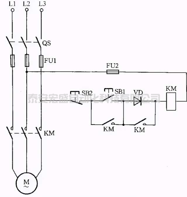 當供電電壓在交流接觸器吸引線圈額定電壓的85%以下時,啟動接觸器銜鐵將跳動不止,不能可靠吸合,在交流接觸器的控制回路中串聯(lián)一只整流管,改為直流啟動交流運行,就可以避免上述問題。交流接觸器低電壓啟動線路如圖14所示。按下按鈕SB1,經(jīng)二極管VD半波整流的直流電壓加在交流接觸器KM線圈上,KM吸合。其輔助觸點將二極管VD短接,交流接觸器投入交流運行。