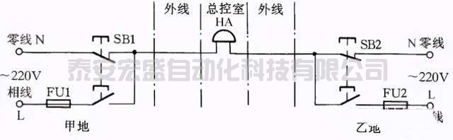 圖23所示線路可使甲乙兩地都能向總控制室發(fā)聯(lián)絡信號。當甲地向總控制室發(fā)信號時,按下按鈕SB1,控制室的電鈴告警。同理當乙地向總控制室發(fā)信號時按下SB2即可。甲乙兩地信號可用信號鈴聲的時間長短或次數(shù)區(qū)分。