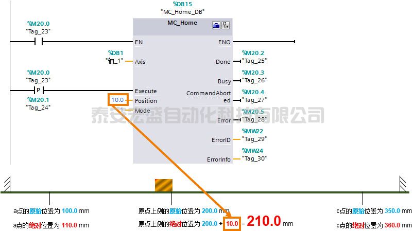 與Mode = 0 相同,以該模式觸發(fā) MC_Home 指令后軸并不運(yùn)行,只是更新軸的當(dāng)前位置值。更新的方式與 Mode = 0 不同,而是在軸原來坐標(biāo)值的基礎(chǔ)上加上“Position”數(shù)值后得到的坐標(biāo)值作為軸當(dāng)前位置的新值。如下圖所示,指令 MC_Home 指令后,軸的位置值變成了 210mm.,相應(yīng)的a和c點(diǎn)的坐標(biāo)位置值也相應(yīng)更新成新值。