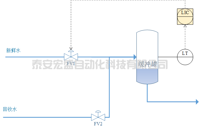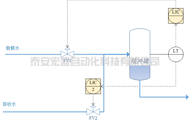 分級(jí)控制:LIC2使用回收水調(diào)節(jié)閥FV2控制,LIC2的設(shè)定值要大于LIC的設(shè)定值。