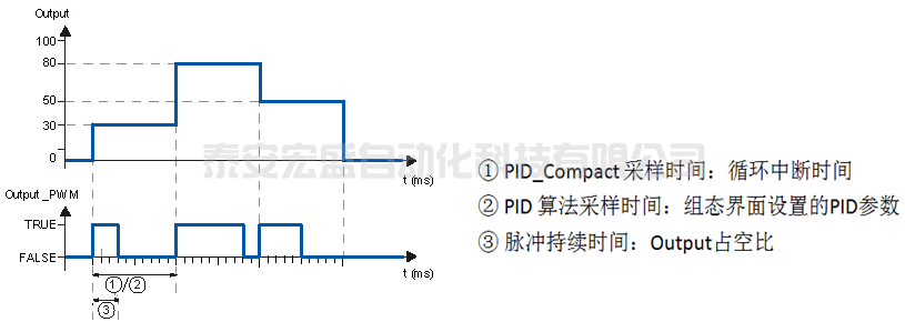 輸出參數(shù) Output 中的值被轉(zhuǎn)換為一個(gè)脈沖序列,該序列通過脈寬調(diào)制在輸出參數(shù) Output_PWM 中輸出。在 PID 算法采樣時(shí)間內(nèi)計(jì)算 Output,在采樣時(shí)間 PID_Compact 內(nèi)輸出 Output_PWM。