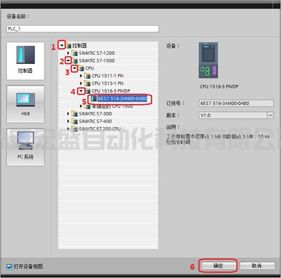 5.接下來我們先插入一個CPU1516-3PN/DP:請依次點擊“控制器”、“SIMATIC S7-1500”、“CPU”、“CPU 1516-3PN/DP”左側的小箭頭展開項目樹,然后選擇PLC訂貨號“6ES7 516-3AN00-0BA0”,最后點擊“確認”按鈕插入: