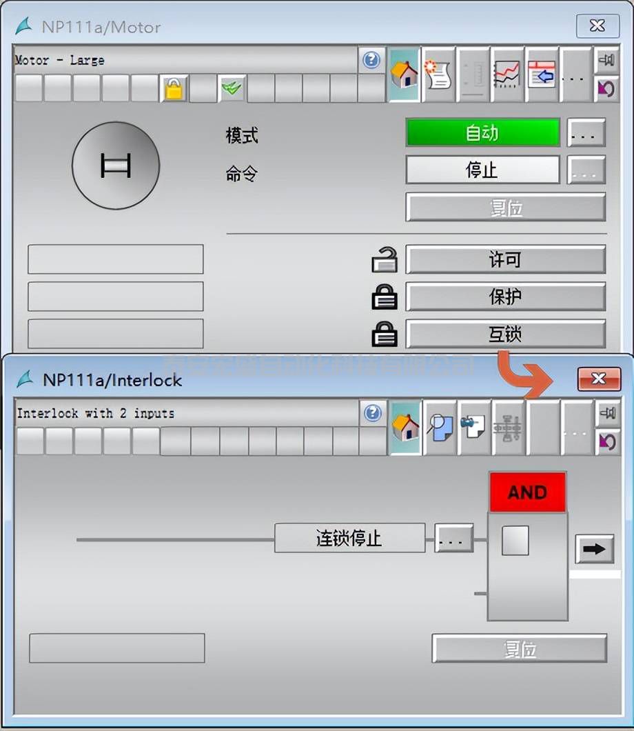 如果只是簡(jiǎn)單的應(yīng)用,其實(shí)我們只需要復(fù)制模板后連接運(yùn)行信號(hào)和控制命令就完成了下位機(jī)程序組態(tài)。執(zhí)行CFC和OS編譯后,在上位機(jī)上就會(huì)自動(dòng)創(chuàng)建了對(duì)應(yīng)的塊圖標(biāo)和面板。把對(duì)應(yīng)的塊圖標(biāo)放置到流程圖中對(duì)應(yīng)的位置,就這么簡(jiǎn)單的完成了上下位的組態(tài)。如果電機(jī)還涉及到啟動(dòng)允許、連鎖保護(hù),模板中也提供了三種連鎖,并且擴(kuò)展到了Interlock功能塊。借助于Interlock功能塊還能在電機(jī)面板中查看連鎖狀態(tài)、跳轉(zhuǎn)到連鎖面板旁通連鎖信號(hào)。