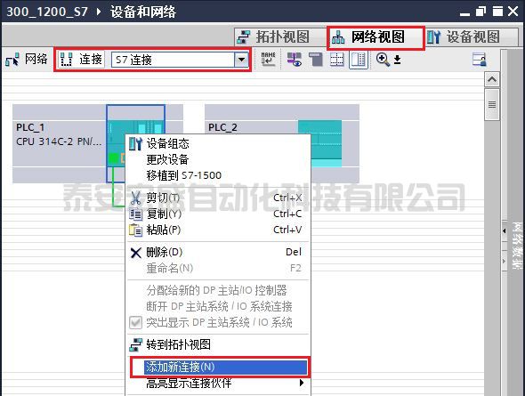 (1)打開 “網(wǎng)絡(luò)視圖” 配置網(wǎng)絡(luò),首先點中左上角的“連接”圖標,選擇“S7 連接”,然后選中 S7-300 CPU,右鍵選擇“添加新連接”添加新的連接,如圖 7 所示。