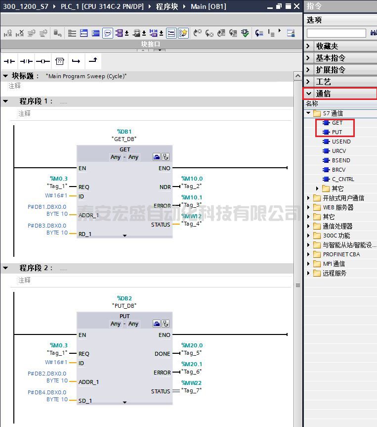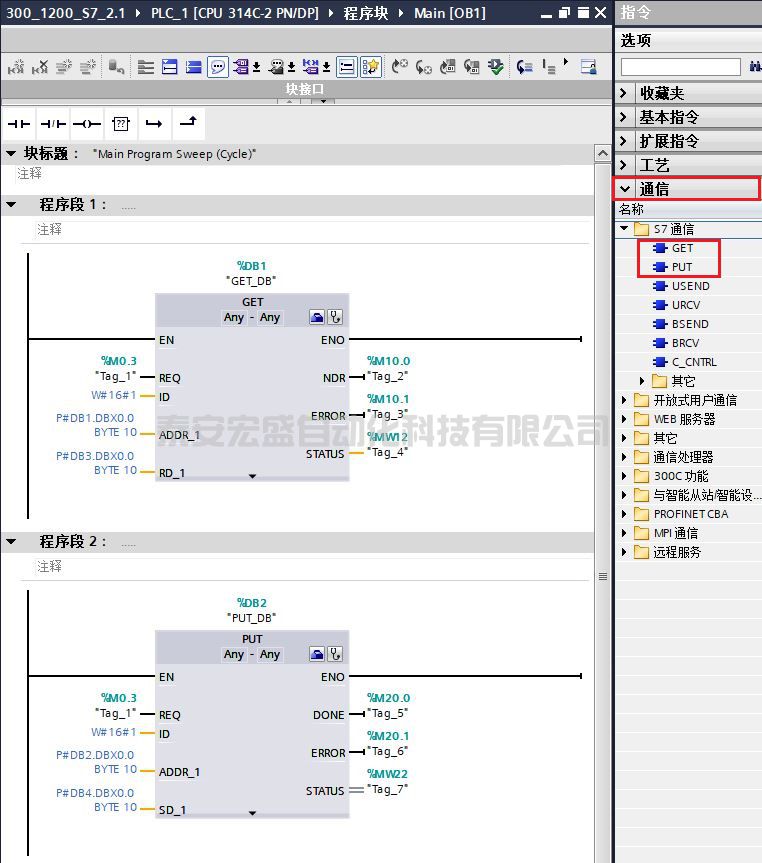 (3)在 OB1 中,從“指令” >“通信” >“S7 通信”下,調(diào)用 GET、PUT 通信指令,程序調(diào)用如圖 20 所示。