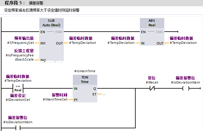 ④程序段4:當(dāng)頻率的輸出值減去反饋值的絕對值大于所設(shè)定的偏差值,則延時(shí)一段時(shí)間報(bào)警。當(dāng)偏差不在設(shè)定范圍內(nèi),則可以復(fù)位。