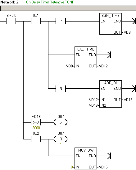 如果輸入點 I0.1 的接通時間等于或大于 3 秒 (3000 ms),輸出點 Q0.1 置位。輸入點 I0.2 用于復(fù)位。
