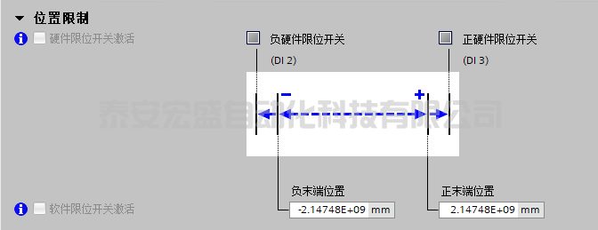 驅動器僅接受位于軟件限位開關內(nèi)的位置設定點。激活的軟件限制開關通過指定 p2580(軟件限位開關負)和 p2581(軟件限位開關正)來限制位置設定值。 使用 c2569(硬件限位開關,負)和 c2570(硬件限位開關,正)在驅動器上評估激活的硬件限位開關。當設備通過硬件限位開關時,驅動器以 OFF3 斜坡下降時間停止軸,并輸出故障 F07491 或 F07492。要使軸回到有效的橫向范圍內(nèi),必須將軸從硬件限位開關處移開,例如,使用點動功能。 可通過 FB38051 功能塊中的控制字來進行軟件限位開關激活及硬件限位激活。