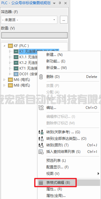 對PLC進行編輯,首先應打開PLC的導航器來輔助進行高效設計,打開方式:視圖→導航器→打開命令下拉找到PLC數據 (前提是需要打開項目的圖紙頁,否則視圖選項卡不會顯示)。在PLC導航器中選擇我們要操作的PLC模塊,如示例所示選中KF1,右擊選擇表格式編輯,即可在界面下方顯示該模塊表格式編輯的界面,如下圖所示。
