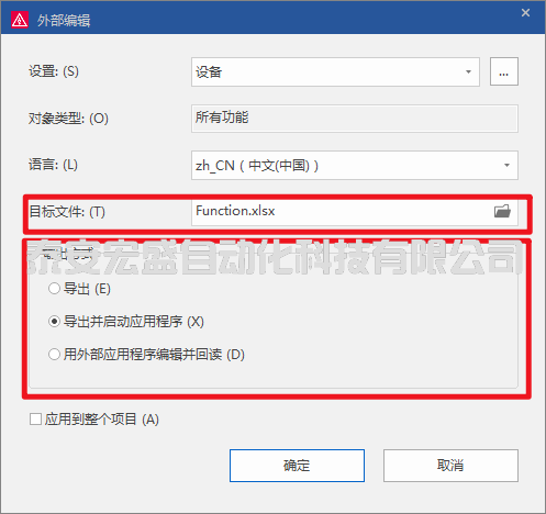 點擊“屬性”按鈕,即可打開外部編輯導出的選擇對話框,如下圖所示。在此我們可配置輸出的語言、目標文件名以及輸出的方式。