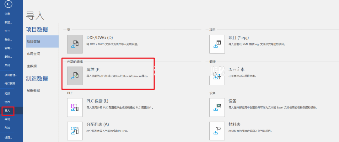 3. 執(zhí)行導入:選中當前項目,打開后臺視圖,點擊文件→導入→外部的編輯→屬性,如下圖所示。
