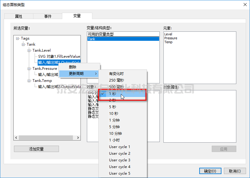 選擇更新周期。可以右鍵單擊每一個(gè)關(guān)聯(lián)了結(jié)構(gòu)變量元素的對象屬性設(shè)置更新周期。(建議選擇統(tǒng)一更新周期如: 1 秒)如圖 6 。