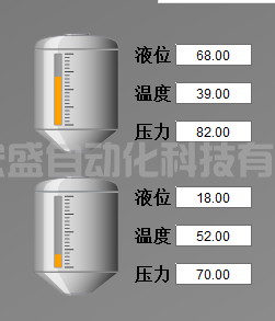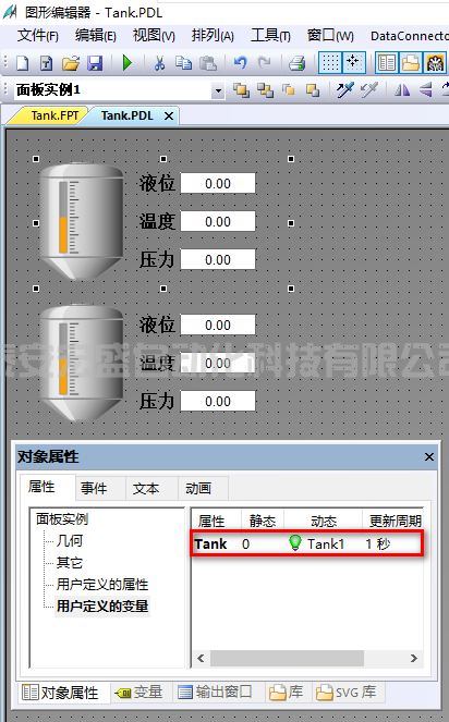 在畫面編輯器中點(diǎn)擊文件菜單選擇“新建面板類型”,并保存為“Tank.FPT”。設(shè)置尺寸為 230*115 。打開SVG 庫,找到 V2.0 中的“Tanks”,添加“Tank2WithScale”到面板類型中。然后添加 3 個(gè)靜態(tài)文本編輯好顯示文本。添加 3 個(gè)輸入/輸出域,命名為“輸入/輸出域1”、“輸入/輸出域2”、“輸入/輸出域3”,無需關(guān)聯(lián)變量。如圖 3 。