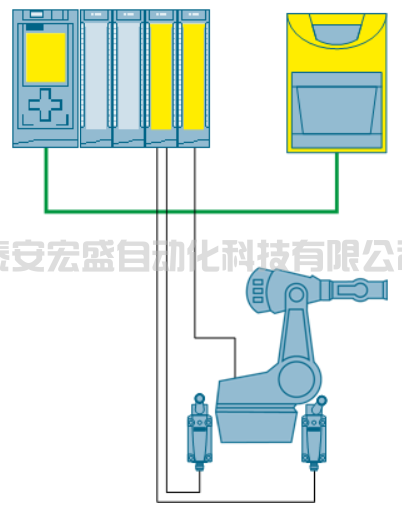 F-CPU 和激光掃描儀可通過 PROFINET 與錯誤安全“PROFIsafe”配置文件進行通信??赏ㄟ^兩個傳感器(例如 SIRIUS 位置開關(guān))來檢測機器人位置。