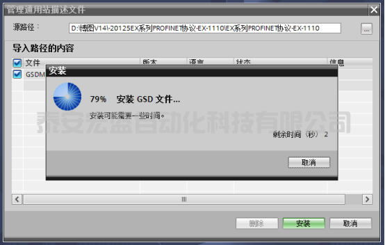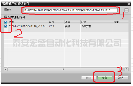 8、點擊打開后對話框如下;在圖1處可以看到顯示GSD文件存放路徑,存放文件路徑后在圖2位置會自動顯示可以加載的GSD文件,此時選中GSD文件,點擊下方3處安裝;