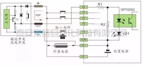 SOURCE源型為電流從輸入端流進(jìn),那么輸入端與電源正極相連即可,說明接口內(nèi)部的光電耦合器為單端共點(diǎn)為電源負(fù)極,可接PNP型傳感器。