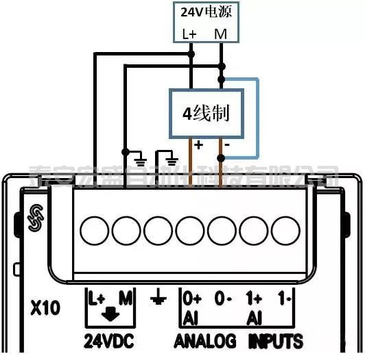 圖1 模擬量模塊接線 模擬量電流、電壓信號根據(jù)模擬量儀表或設(shè)備線纜個數(shù)分成四線制、三線制、兩線制三種類型,不同類型的信號其接線方式不同。四線制信號指的是模擬量儀表或設(shè)備上信號線和電源線加起來有4根線。儀表或設(shè)備有單獨的供電電源,除了兩個電源線還有兩個信號線。四線制信號的接線方式如下圖2模擬量電壓/電流四線制接線所示。