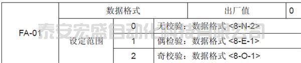由上圖可知,匯川變頻器數(shù)據(jù)格式有3種模式,默認(rèn)值為0,本例選擇0。無(wú)校驗(yàn)時(shí),每個(gè)字節(jié)長(zhǎng)度為11 位,其中1 位起始位,8 位數(shù)據(jù)位,2 位結(jié)束位。上位機(jī)與變頻器設(shè)定的數(shù)據(jù)格式必須一致,否則,通訊無(wú)法進(jìn)行。