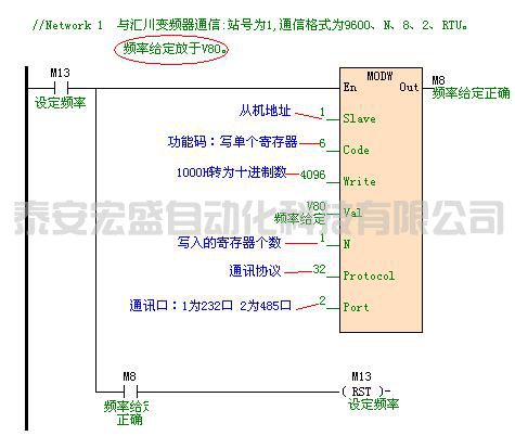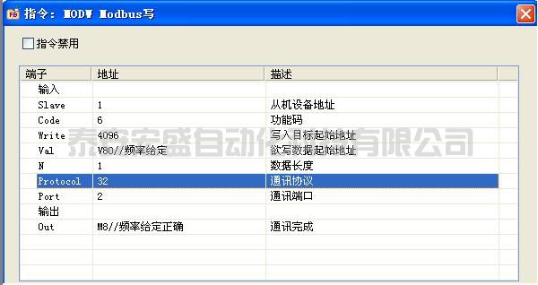 通過(guò)以上設(shè)置我們可知,本例控制匯川變頻器采用Modbus通信協(xié)議,通信資料格式為:9600 N 8 2 ,變頻器的地址為1。然后對(duì)相應(yīng)的地址寫(xiě)值就可以了。