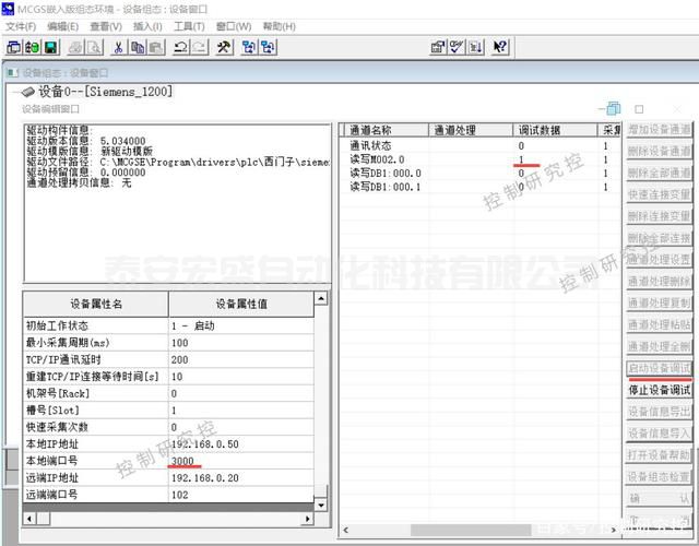 這個(gè)圖片上可以看到是西門子1200plc和觸摸屏通訊,通訊狀為0表示通訊正常,M002.0此時(shí)的值為1,是因?yàn)槲页绦蛑蠱2.0的值為1,也就是說啟動(dòng)設(shè)備調(diào)試后就能監(jiān)控到PLC程序中的點(diǎn)位實(shí)際值了,當(dāng)然這個(gè)圖片其實(shí)是監(jiān)控的模擬plc的值。---這個(gè)圖片上還需要說明的一點(diǎn)就是本地端口號(hào),mscg是建議3000以上的值,初始打開這里可能是0,可能會(huì)造成通訊不上。