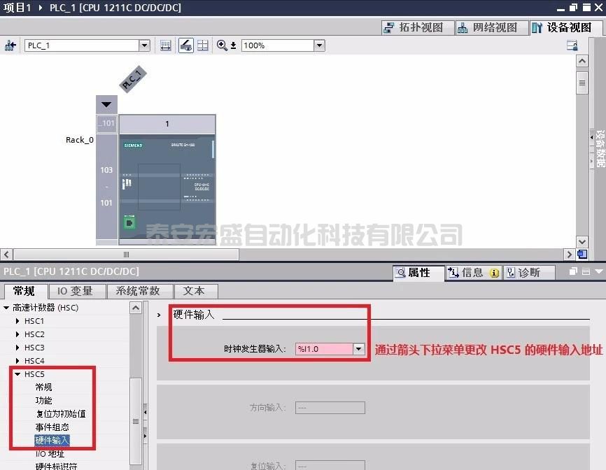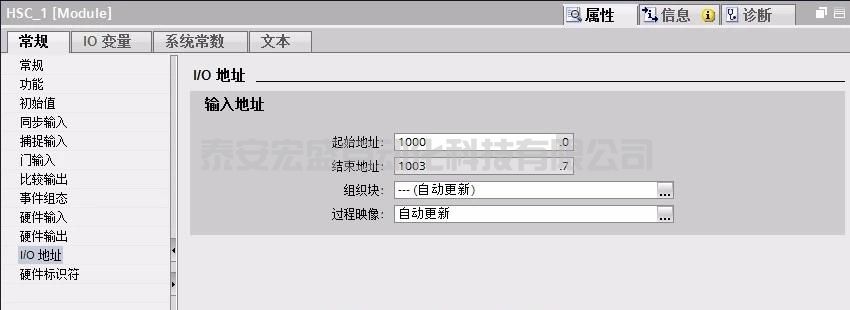 3在設(shè)備視圖>HSC_1>屬性>I/O地址,使用缺省地址1000作為高速計(jì)數(shù)器地址。