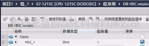 添加一個(gè)新的 DB 命名為 DB HSC retain,并且創(chuàng)建一個(gè)DINT數(shù)據(jù)元素,命名為HSC_1用于保存高速計(jì)數(shù)器的值。為了實(shí)現(xiàn)這個(gè)功能,HSC_1通過勾選保持項(xiàng)實(shí)現(xiàn)數(shù)據(jù)保持。