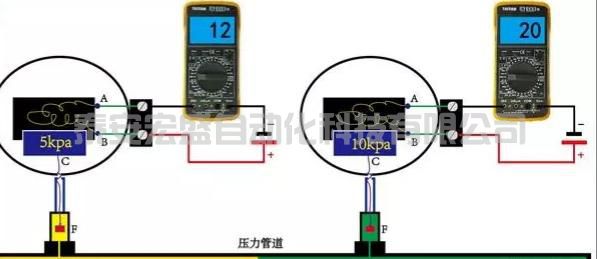 我們管道上安裝一塊量程為0-10kpa的壓力變送器,電源正極接壓力變送器的B點,負(fù)極串聯(lián)一塊萬用表到壓力變送器的A點,并將萬用表打到電流檔。當(dāng)壓力變送器C點的壓力是5kpa時,萬用表的的電流讀數(shù)是12mA。正好是4-20mA的電流信號的中間值,而5kpa也正好是0-10kpa壓力值的中間值。當(dāng)壓力變送器C點的壓力是10kpa時,萬用表的的電流讀數(shù)正好是20mA。這樣0-10kpa壓力值就對應(yīng)了4-20mA的電流信號值,我們只要在遠(yuǎn)方通過一個接受設(shè)備把這個4-20mA的電流信號值提取出來,再通過一定的計算,就能知道就地的壓力值是多少了。
