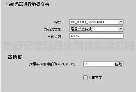 編碼器類型選擇增量式旋轉(zhuǎn)式。單轉(zhuǎn)步數(shù)填寫 V90 每轉(zhuǎn)輸出脈沖個數(shù)的 4 倍(信號評估選擇了四重),這里填寫 4096(4*1024)。增量實際值中的位填寫0。